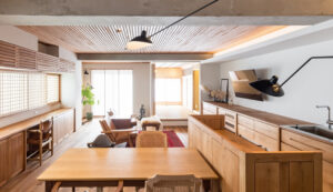 木繊維断熱材シュタイコゼル/漆喰仕上げ/構造の梁見せ/クリ無垢床/製作建具/製作家具/間接照明/高気密高断熱(当日までには気密測定実施)